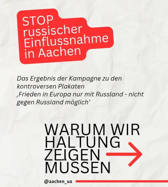 Ukrainische Community und Demokraten & Demokratinnen in Aachen empört: Prorussische Propaganda auf Werbeflächen. In Aachen sind derzeit Plakate zu sehen mit dem Slogan: „Frieden in Europa ist nur mit Russland möglich, nicht gegen Russland.“